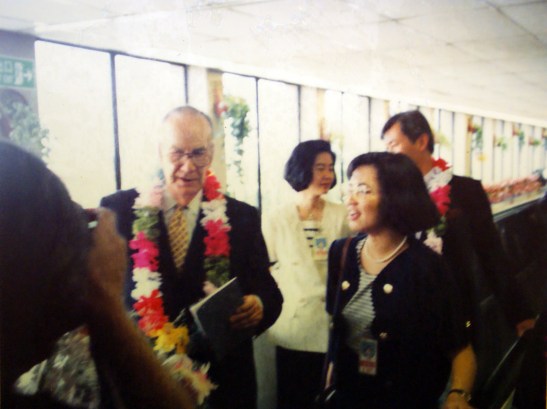 塞拉抵達(桃園)中正機場,左後奧林匹亞基金會吳經國委員夫人;右旅西畫家梁君午教授陪同。